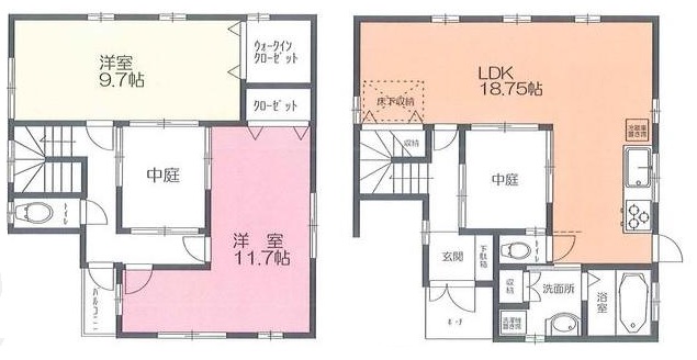 | 設備・条件 | バストイレ別 独立洗面台 室内洗濯機置き場 システムキッチン トイレ2ヶ所 ウォークインクローゼット クローゼット 床下収納 階段下収納 中庭 バルコニー |